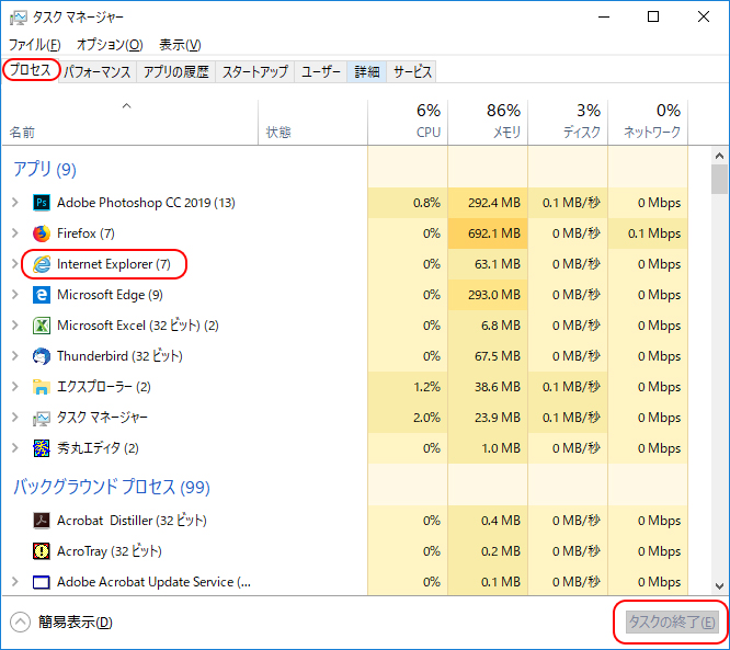 タスクマネージャーで閉じる