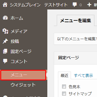 管理ページ左列メニューに並ぶ、「メニュー」で、サイト内の「メニュー」を設定します。