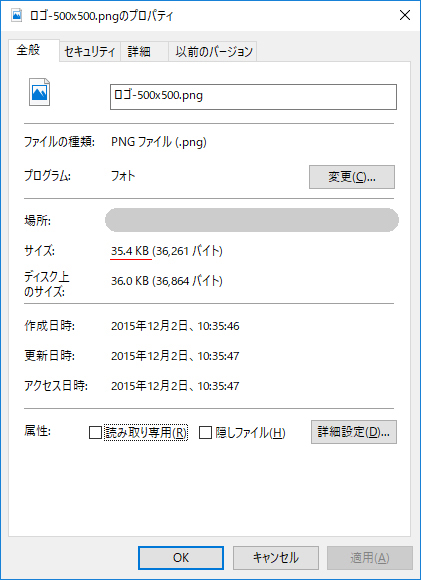 また、上記の方法で確認できない場合、画像を右クリックし、表示された一覧の中から”プロパティ”という項目をクリックします。すると下図のようなウィンドウが表示されるので、その中のサイズという項目に記載されているのがその画像のサイズです。