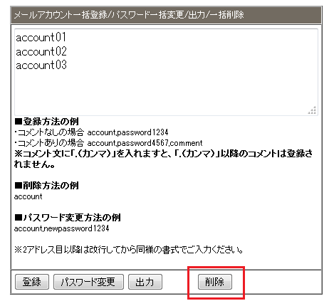 2 「メールアカウント一括登録/パスワード一括変更/出力/一括削除」の入力欄に削除したいアカウントを入力して「削除」ボタンをクリックします。
