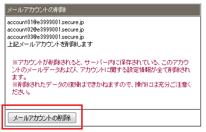 メールアカウントが削除されると、サーバー内に保存されているメールアカウントのメールデータおよび、設定情報がすべて削除されます。