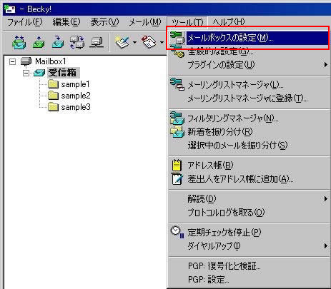 1 Beckyを起動し、メニューバーの【ツール】から【メールボックスの設定】をクリックします
