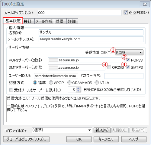 ①受信プロトコル POP3 を選択します