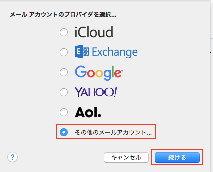 1 「メール」を起動し、【その他のメールアカウントを追加】にチェックを入れて【続ける】をクリックします。