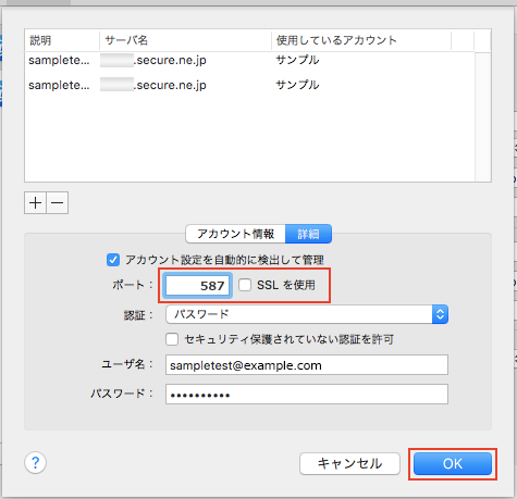 OS X 付属のメールは、アカウント作成時にデフォルトで SSL を利用する内容で設定されます。