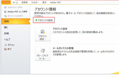 1 Outlook2010を起動し、メニューバーの【ファイル】>>【情報】>>【アカウントの追加】をクリックします。