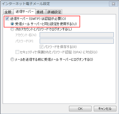2 詳細設定ボタンをクリックして、送信サーバータブの【送信サーバー(SMTP)は認証が必要】にチェックをいれます。