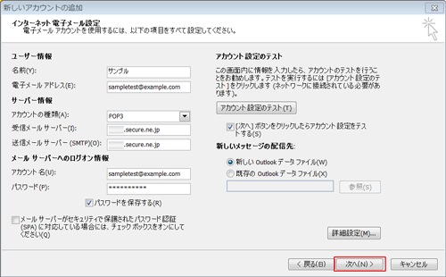 1【ユーザー情報】、【サーバー情報】、【メールサーバーへのログオン情報】を入力して【アカウント設定のテスト】ボタンをクリックします。