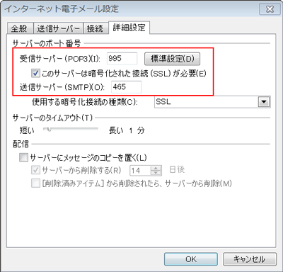 詳細設定タブの受信サーバーを 995 に、送信サーバーを 465 に変更します。