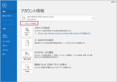 Outlookを起動したら「ファイル」-「情報」より「アカウントの追加」をクリックします。