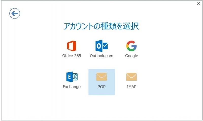 4「アカウントの種類を選択する」の画面になるので、要件に応じてPOPまたはIMAPを選択します。