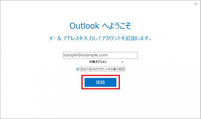 詳細オプションを開いて「自分で自分のアカウントを手動で設定」にチェックを入れます。入力完了後「接続」ボタンをクリックします。