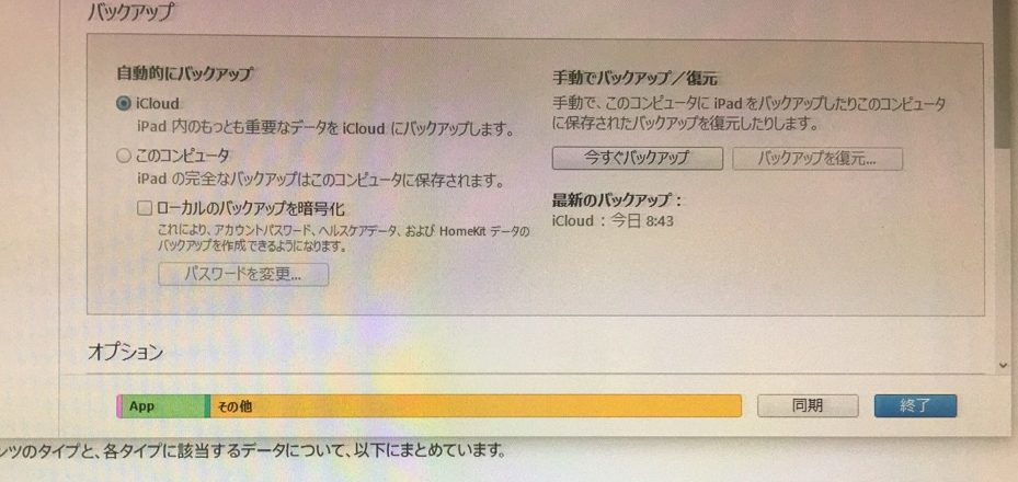 最初にipadをPCに繋ぎ、itunesを立ち上げて”今すぐバックアップ”にてバックアップを取る。
